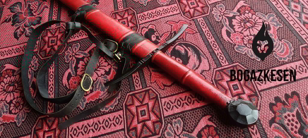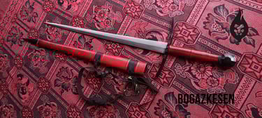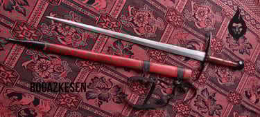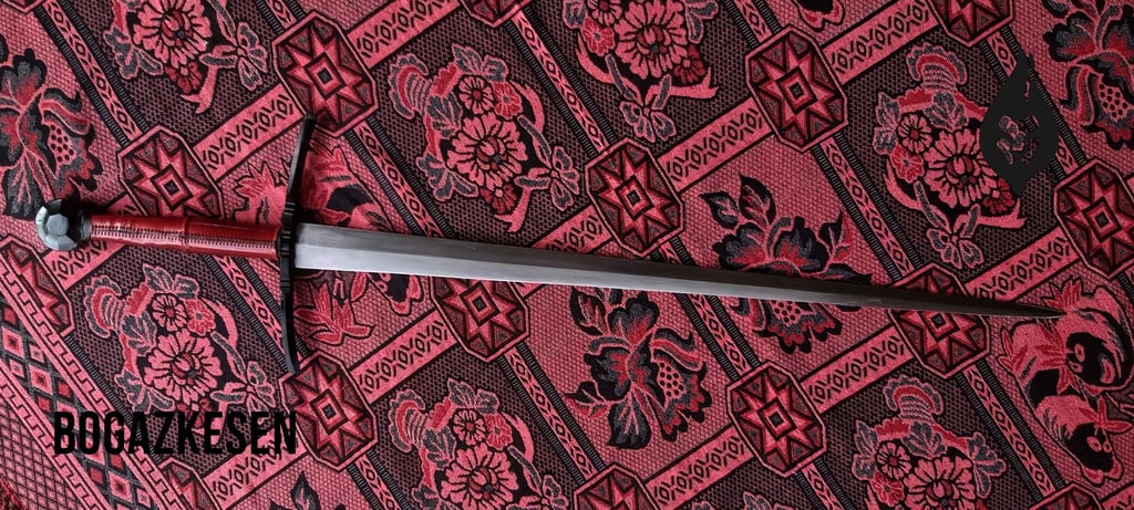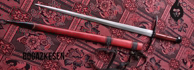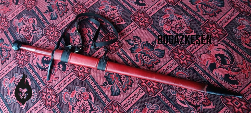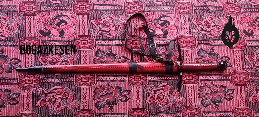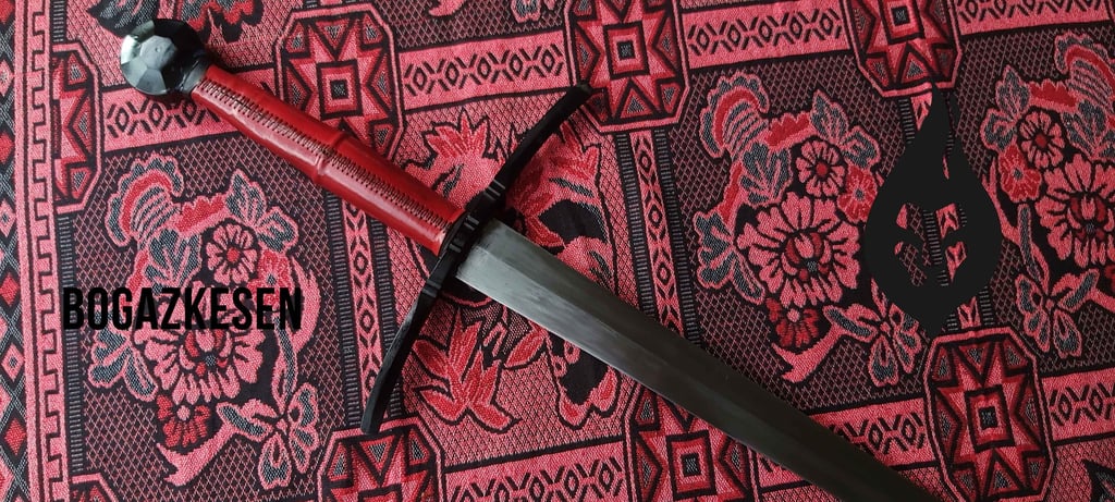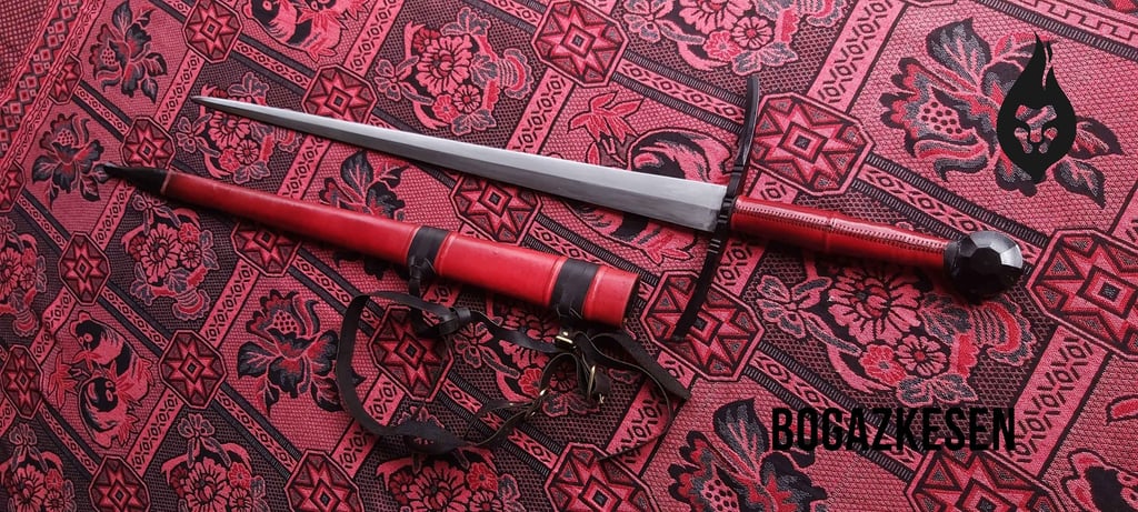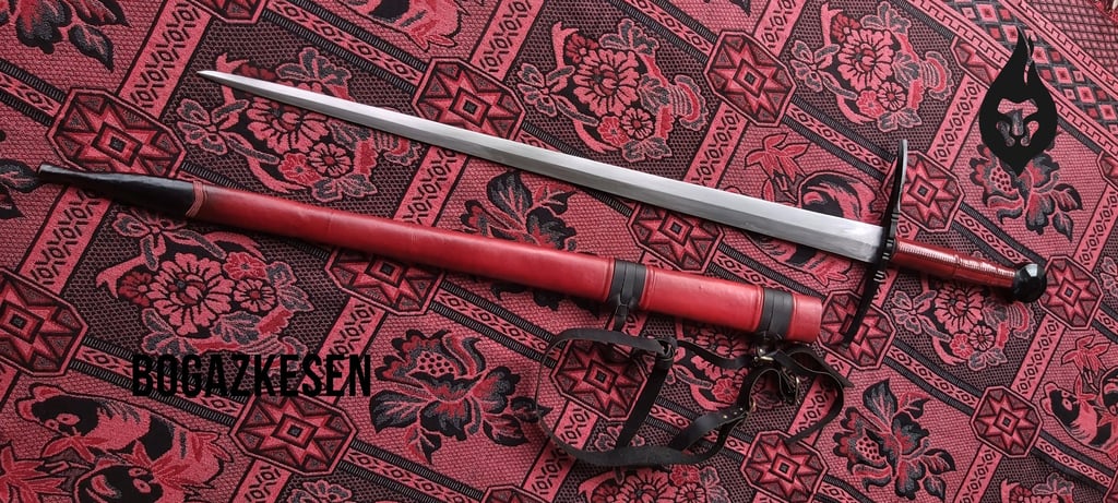 Spring steel blade, guard and pommel. red leather, wooden core scabbard