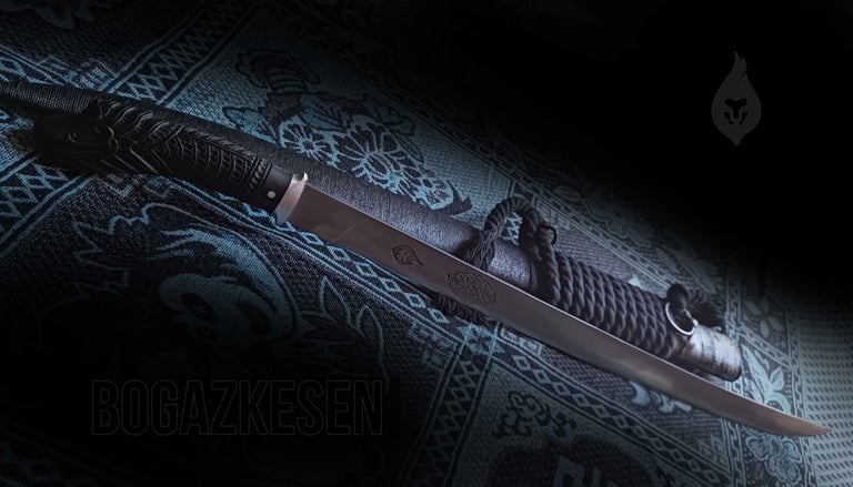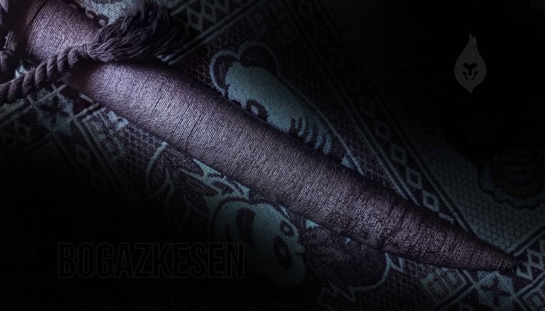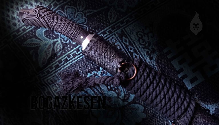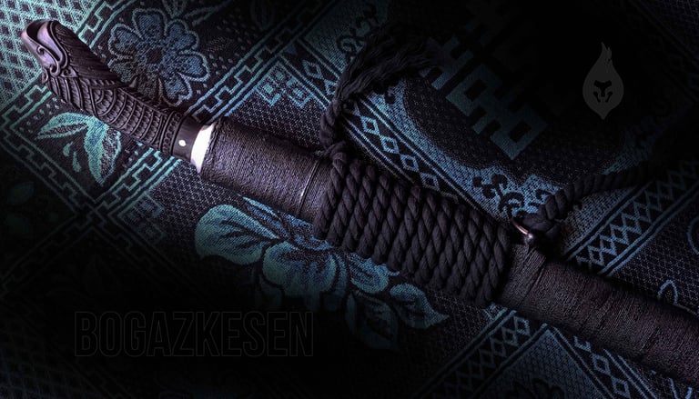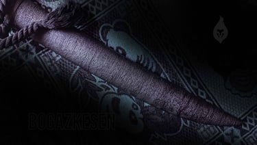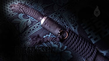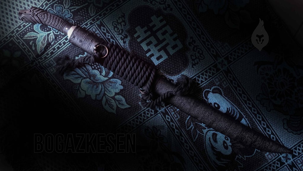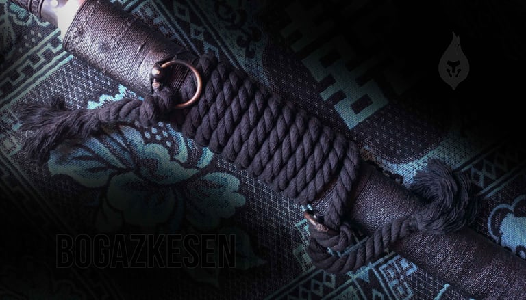 rosewood sheath wrapped in hardened wool thread, black wool sling strap.