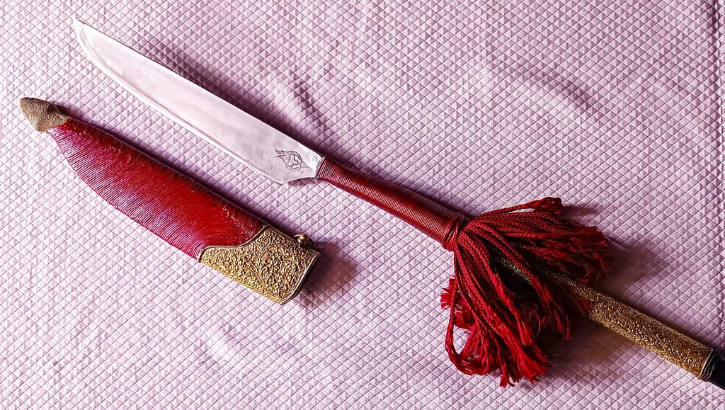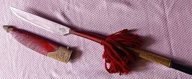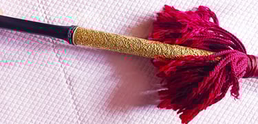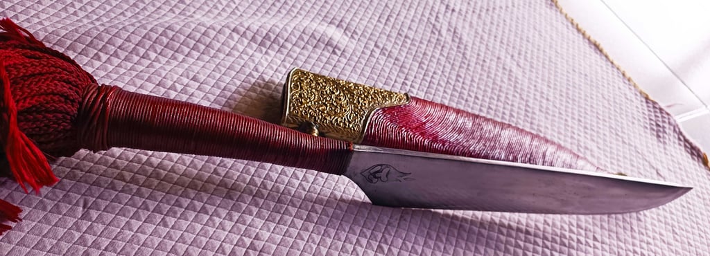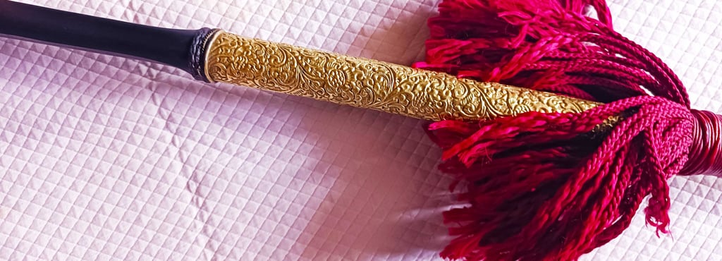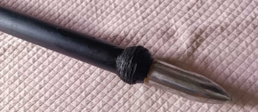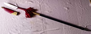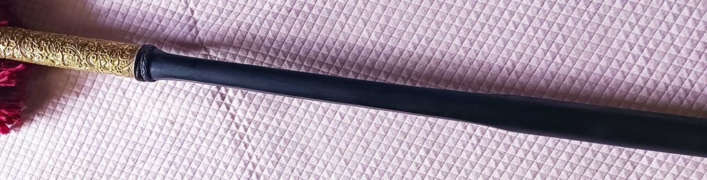 Shaft material : Schoutenia ovata wood, brass with floral pattern repousse fitting, red cotton thread